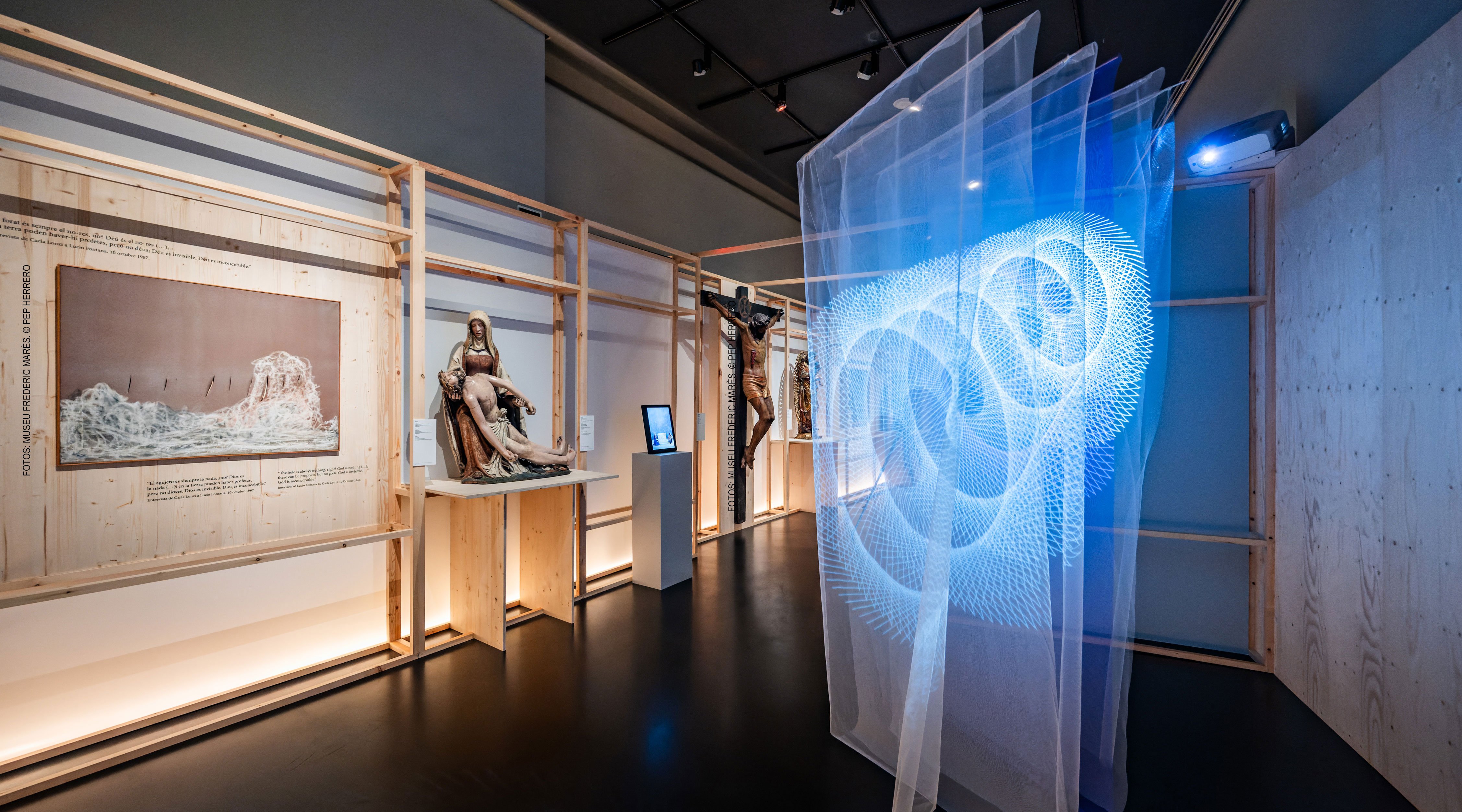 A través de María, de su dolor y de su gloria, Victoria Cirlot recoloca algunas de las más emblemáticas esculturas góticas y renacentistas del Museu Frederic Marès, como el calvario de la iglesia de San Miguel de Támara (Palencia), de finales del siglo XIII, y las enfrenta a las videoinstalaciones de Bill Viola, una composición de Antoni Tàpies o los juegos lumínicos de Javier Riera. “Me dedico a conectar la Edad Media con las vanguardias del siglo XX”, resume. Pero, realmente, lo que hace va mucho más allá. Enfrenta al arte contemporáneo, a través de los siglos, esas emociones que María vive en la Pasión y también ante la Resurrección de su Hijo: dolor, tristeza, pasión, sufrimiento, esperanza, alegría, gloria, amor…