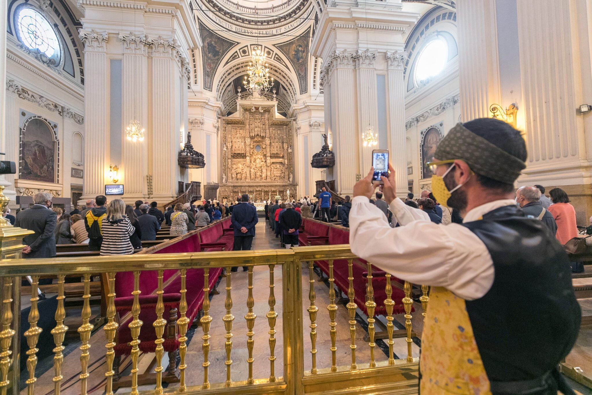GRAF9515. ZARAGOZA, 12/10/2020.- Pese a la suspensión de las Fiestas del Pilar y de su acto central, la Ofrenda de Flores, algunos ciudadanos se han acercado a visitar la Plaza del Pilar, a depositar flores ante la imagen de la Virgen y a asistir a misa, aunque con el aforo limitado al cincuenta por ciento de su capacidad. EFE/Javier Cebollada