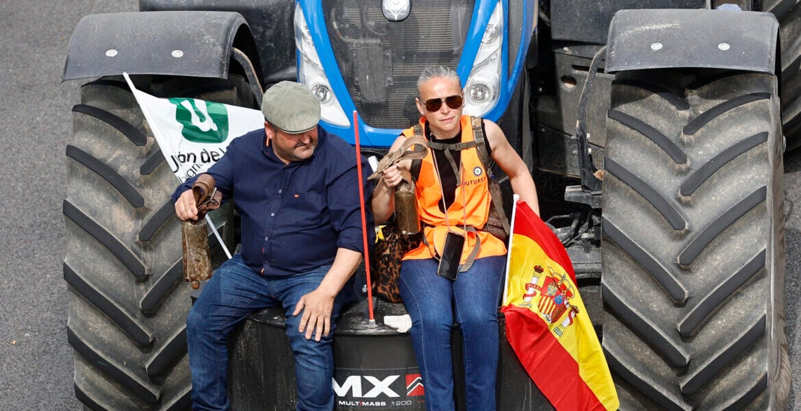 MADRID, 17/03/2024.- Agricultores y ganaderos participan en una tractorada de protesta en Madrid este domingo. Los agricultores y ganaderos han empezado ya a concentrarse en torno al Ministerio para la Transición Ecológica para iniciar la manifestación que unirá a entre 150 y 200 tractores, dos mil personas y 50 autobuses, convocados por Unión de Uniones, con el fin de pedir soluciones para el campo. EFE/Rodrigo Jiménez