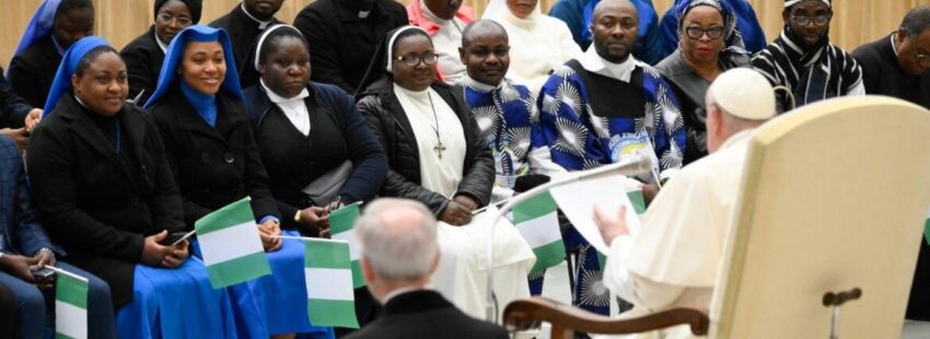 El Papa quiso agradecer la entrega de los sacerdotes y consagrados nigerianos, por su “generosidad, humildad y perseverancia”. “Sed siempre discípulos misioneros, agradecidos de que el Señor os haya elegido para seguirlo y os haya enviado a proclamar con celo nuestra fe y contribuir a la construcción de un mundo más justo y humano”, los aconsejó el Obispo de Roma. Además, los hizo un encargo: “trabajar por la reconciliación entre todos vuestros hermanos, contribuyendo a aliviar la carga de los pobres y más necesitados y haciendo vuestro el estilo de Dios”.