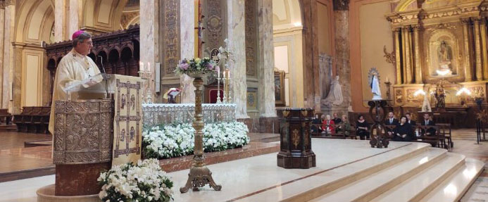 El titular de la arquidiócesis de Buenos Aires relacionó el texto del Evangelio en el que María Magdalena se asoma al sepulcro y ve a dos ángeles vestidos de blanco que le preguntan por qué llora con el acontecimiento de Malvinas. Y expresó: “Me animo, en el contexto de esta misa, a hacer una interpretación libre, y ponerle nombre a estos dos ángeles: Gran Malvina y Soledad” (nombre de cada una de las islas).