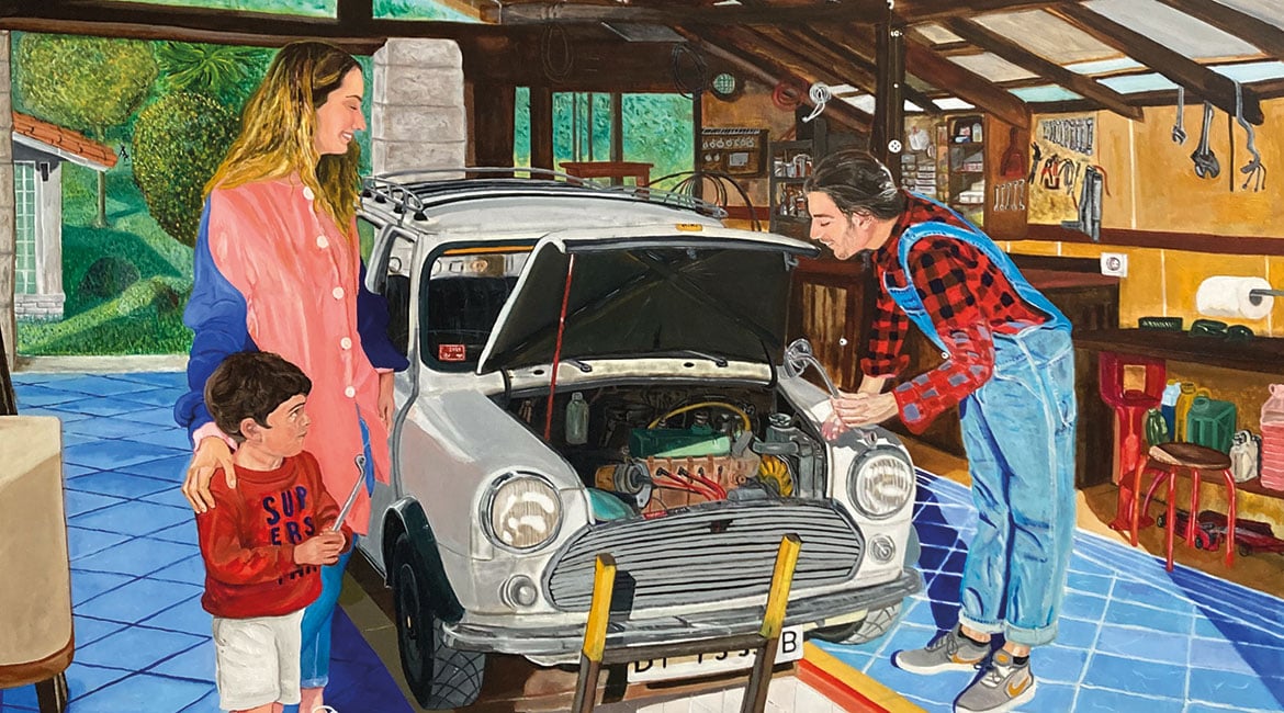 “Me hacía ilusión pintar una Sagrada Familia, si quieres, obrera –explica a ‘Vida Nueva’–. A mí me interesaba ver a san José trabajando. Pero me lo imaginaba en un taller, al principio de carpintería, lo lógico. Luego, pensando en traerlo al mundo contemporáneo, pensé que en el evangelio dice que san José era un artesano. No especifica si era carpintero o hacía más cosas. Eso me ha dado la licencia creativa para representarlo en un taller de coches clásicos. Que ya ahí estoy mezclando mi bagaje de hobbies y de historias. Tengo un Mini del año 73, es mi único coche y he aprendido mecánica desde que tengo ese coche”.