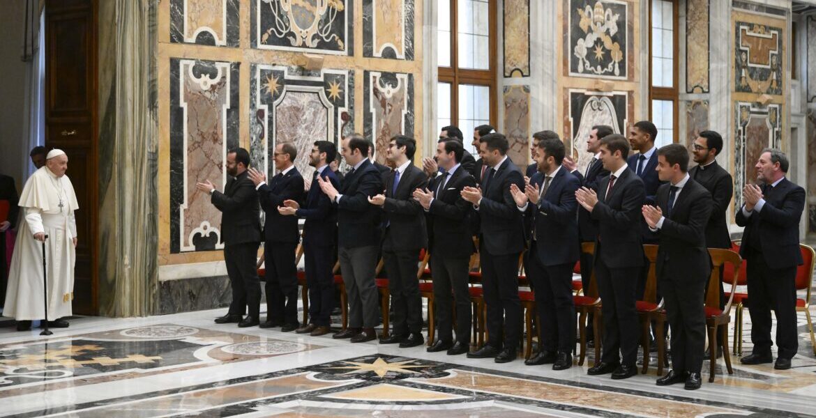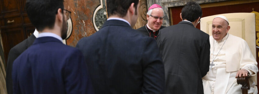 A las diez de la mañana arrancaba esta cita en la Sala Clementina de los Palacios Apostólicos, en la que participaron 36 seminaristas de los dos centros, seis formadores, cuatro sacerdotes sevillanos estudiantes en Roma y un presbítero que es oficial en el Dicasterio para el Clero. Además de pronunciar el discurso que traía bajo el brazo, como sucediera con los formandos de Madrid, el Sucesor de Pedro inició un diálogo abierto con los seminaristas, que correspondieron con varias preguntas sobre cuestiones relativas a la formación y a la misión del presbítero hoy.