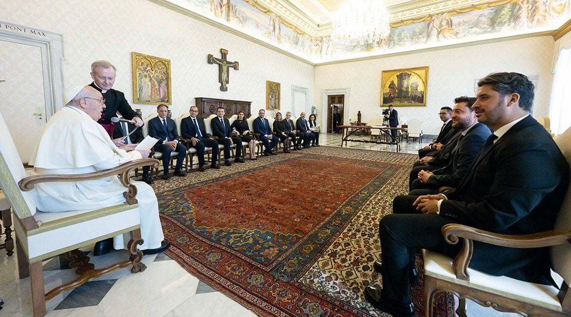 Francisco recibió el 13 de abril en la biblioteca privada del Palacio Apostólico del Vaticano, a los alcaldes y alcaldesas del Grupo de Ciudades Patrimonio de la Humanidad de España, con motivo el 30 aniversario de la creación de esta plataforma que reúne a las quince localidades reconocidas por la Unesco por sus valores universales excepcionales.