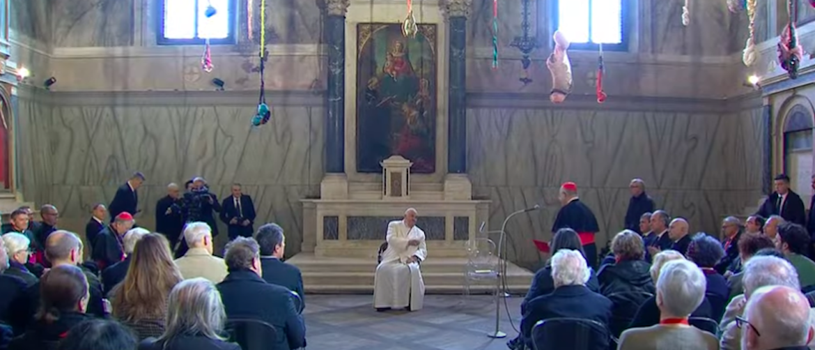 Habiendo concluido el encuentro con los reclusos en el patio interior de la prisión, el papa Francisco se ha dirigido a la capilla de la misma para su encuentro con los artistas, donde fue recibido por el cardenal José Tolentino de Mendonça, prefecto del Dicasterio para la Cultura y la Educación y Comisario del Pabellón de la Santa Sede en la Bienal de Arte de Venecia.