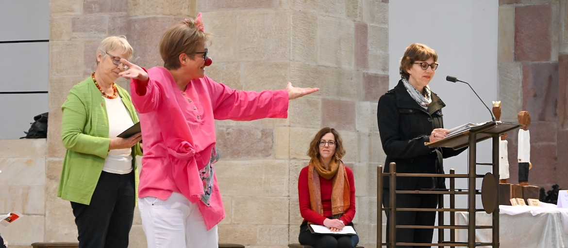 Pero, ¿por qué la nariz de payaso? La artista que actuó en la catedral de Speyer tradujo las esperanzas y deseos de las mujeres católicas a movimientos. Finalmente bailó frente al altar con las palabras: “Ven a Dios. Él te revivirá”, levantando sus manos hacia el cielo.