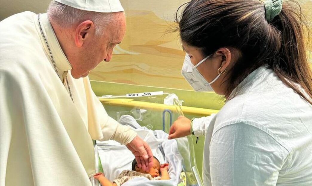 This afternoon Pope Francis went to visit the children hospitalized in the pediatric oncology department of the Gemelli hospital, bringing them rosaries, chocolate eggs and copies of the book "Jesus was born in Bethlehem of Judea", in Rome, Italy, 31 March 2023. During the visit, which lasted about half an hour, the Pope imparted the sacrament of baptism to a baby named Miguel Angel, a few weeks old. At the end he returned to his department. Pope Francis is expected to leave Rome's Gemelli hospital, which he was admitted to on Wednesday with respiratory problems, on Saturday and take part in the Palm Sunday Mass in St Peter's Square the following day, the Vatican said on Friday. ANSA/ HOLY SEE PRESS OFFICE +++ ANSA PROVIDES ACCESS TO THIS HANDOUT PHOTO TO BE USED SOLELY TO ILLUSTRATE NEWS REPORTING OR COMMENTARY ON THE FACTS OR EVENTS DEPICTED IN THIS IMAGE; NO ARCHIVING; NO LICENSING +++ NPK +++