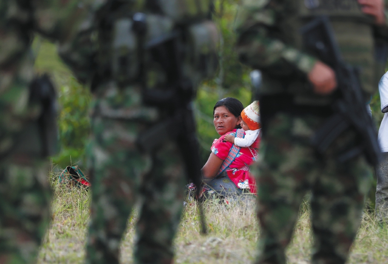 AME773. CALDONO (COLOMBIA), 20/08/2022.- Una indígena reacciona entre soldados hoy, en la instalación del PMU (Puesto de Mando Unificado) Por la Vida, para la prevención del asesinato de líderes sociales e indígenas en Caldono, Cauca (Colombia). El Gobierno colombiano instaló este sábado en el municipio de Caldono (suroeste) el primer Puesto de Mando Unificado por la vida (PMU), que busca proteger la población afectada por la violencia, especialmente los líderes sociales, indígenas, y desmovilizados. EFE/ Ernesto Guzmán