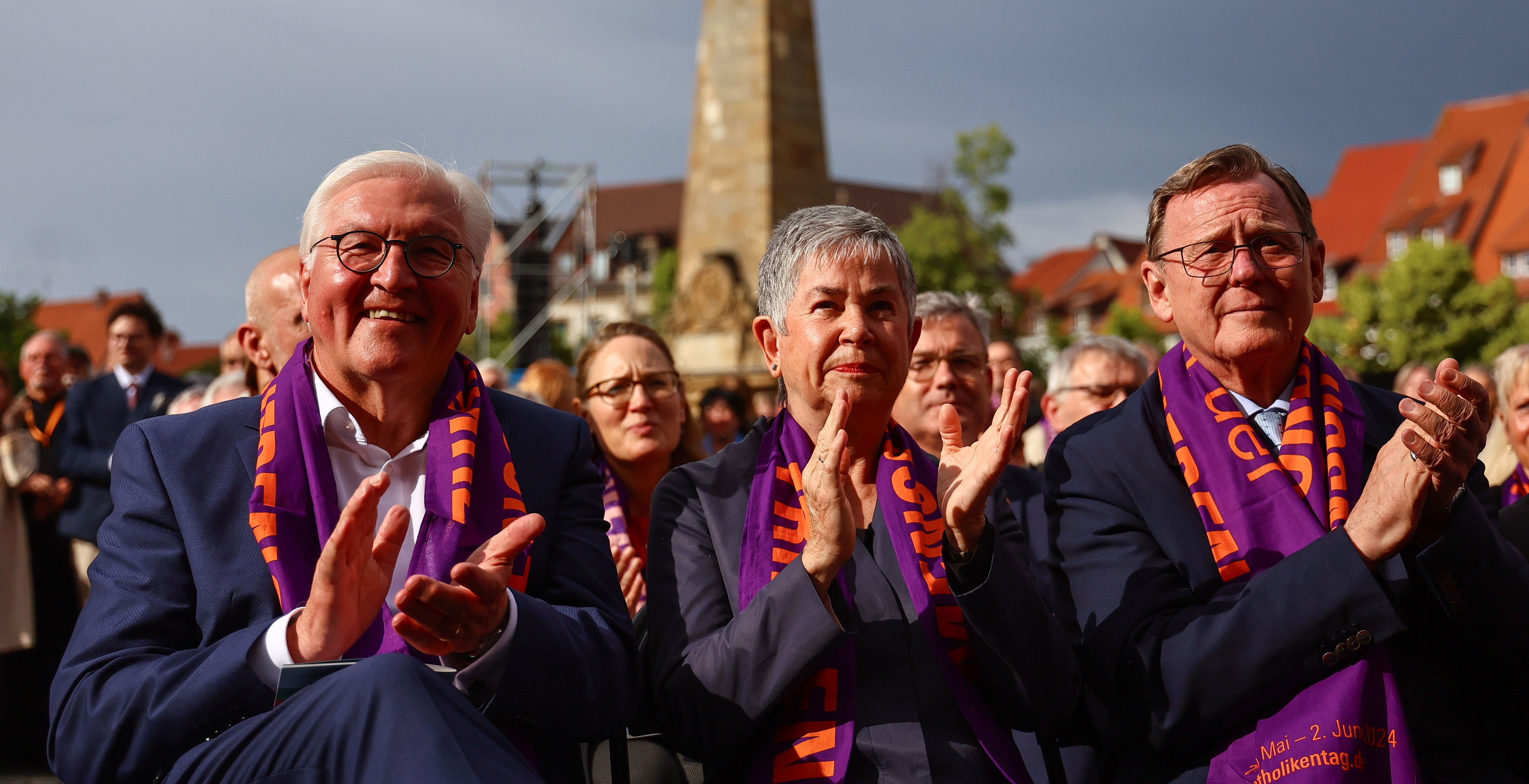De izquierda a derecha, el presidente alemán, Frank-Walter Steinmeier; la presidenta del Comité Central de Católicos Alemanes (ZdK), Irme Stetter-Karp; y el primer ministro del Estado de Turingia, Bodo Ramelow, en la ceremonia de apertura de la 103ª Convención Católica Alemana en Erfurt, el 29 de mayo.