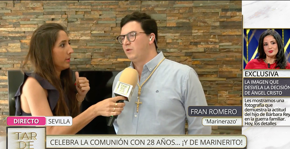 Este joven abogado de Trebujena ha celebrado su fiesta por todo lo alto, vestido de marinerito con una cruz en el cuello y ha confesado que al recibir el “pan de los ángeles” se ha quitado “una espinita”, señaló a Ana Rosa Quintana en el programa de Telecinco ‘TardeAR’. Tampoco faltó en la fiesta la tarta o los castillos hinchables. “El próximo mes de octubre me caso en El Rocío y había que iniciar todos los trámites para casarnos”, explicó en el espacio televisivo.