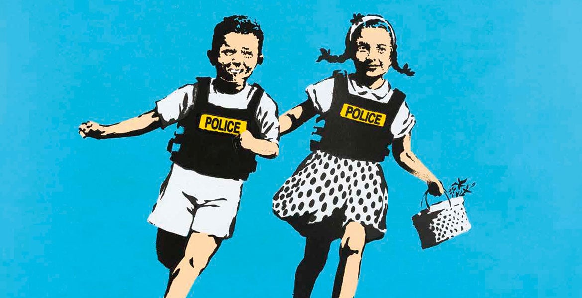 La obra reapareció durante la presentación del proyecto ‘Stealing Banksy?’ en 2014 y luego fue vendida poco después. Nuestra querida niña, símbolo universal de esperanza para los corazones sensibles, pertenece a un nutrido grupo de niñas y niños que pueblan los muros de Banksy. Tomemos como ejemplo a ‘Jack & Jill’, dos adolescentes que corretean con chalecos antibalas de policía. Representan la mejor manera de desmontar la retórica del control, jugando con los estereotipos de los miedos sociales, utilizando la ironía como arma que trastoca el sentido de las cosas.