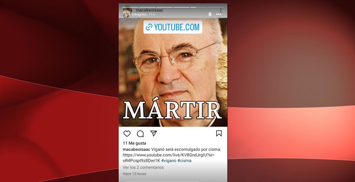 Y es que, a través de su cuenta de Instagram ‘Te hago luz’, las religiosas excomulgadas han hecho suyo el posteo del influencer ‘Macabeoisaac’ en el que aparece una imagen de Viganò, al que califica de “mártir”. Lo cierto es que la investigación abierta por Roma contra el ex nuncio ha coincidido en el tiempo con el decreto de excomunión que el arzobispo de Burgos y comisario pontificio, Mario Iceta, dio a conocer este sábado contra diez de las clarisas que habitan el monasterio de Belorado.