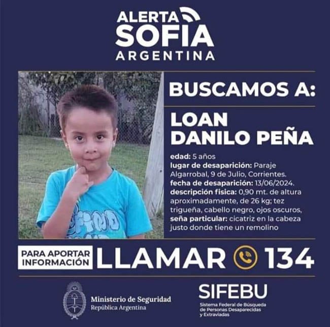 La Comisión Episcopal de Migrantes e Itinerantes (CEMI), que trabaja el área de Trata de Personas, junto a la CONFAR de la Región NEA, manifestaron su preocupación por la desaparición de Loan Peña, un menor de 5 años, que se perdió el pasado jueves 13 de junio, en 9 de Julio, una localidad al oeste de la provincia de Corrientes.