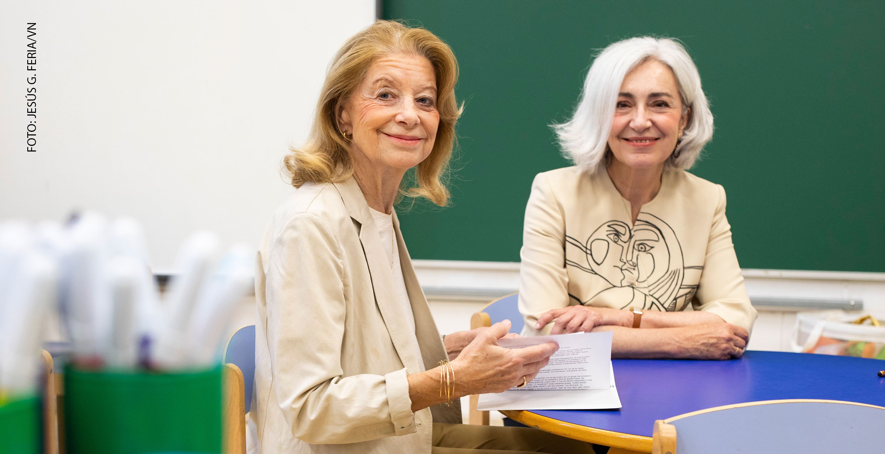 No en vano, “podríamos perfectamente ser hermanas; no hay una diferencia de edad como para hablar de un salto generacional”, sostiene Carmen Guaita, ante el gesto de sorpresa de María de la Válgoma, su compañera de sillita. Sí, de sillita, porque ambas han querido sentarse en un aula de infantil del madrileño Colegio Nuestra Señora del Pilar, de la Compañía de María. Un marco a juego con los colores, las formas y el tamaño de cualquier clase como la que ocuparán sus nietas en unos pocos años.