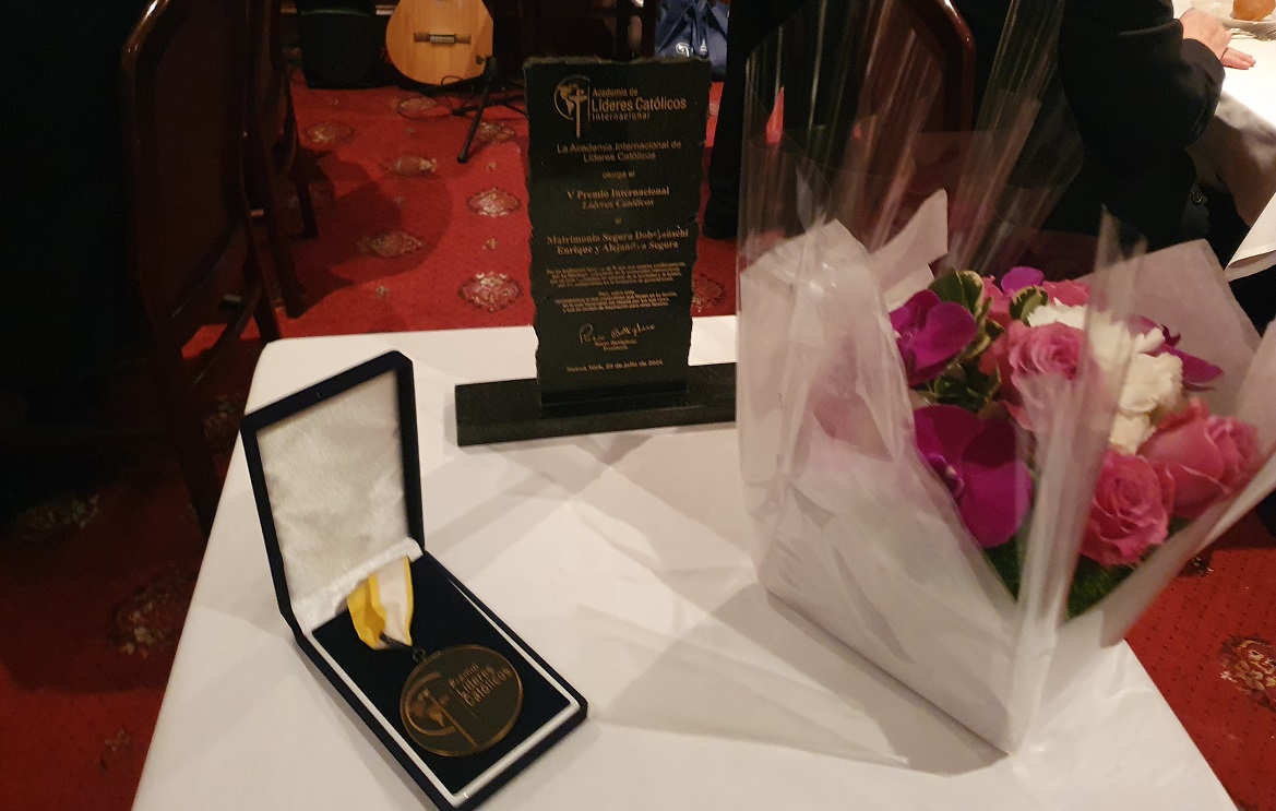 La Academia Internacional de Líderes Católicos ha querido galardonar a Enrique Segura, ex presidente del Consejo de Catholic University of America, y Alejandra Segura, presidenta de la Red Internacional de Mujeres Líderes Católicas. Este premio busca reconocer la labor de los católicos comprometidos con los valores y la promoción del evangelio en el mundo actual, así como su testimonio en las áreas política, económica y social. El reconocimiento fue entregado por el Presidente de la Academia Internacional de Líderes Católicos, Rocco Buttiglione.