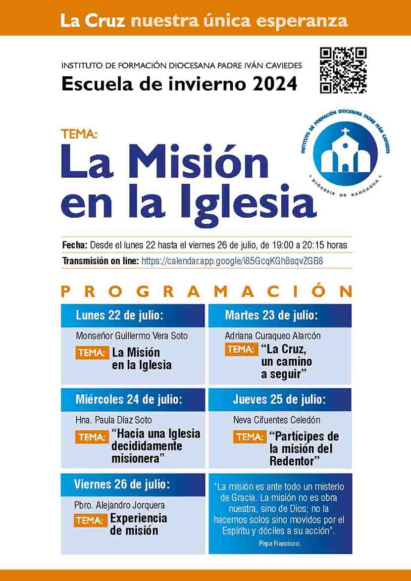 La Escuela de Invierno abordó “La misión en la Iglesia”, a cargo del obispo diocesano Guillermo Vera; “La cruz, un camino a seguir”, “Hacia una iglesia decididamente misionera”, “Partícipes de la misión del Redentor”, temas presentados por 3 integrantes mujeres del secretariado de pastoral de la Conferencia Episcopal de Chile; y “Experiencia de misión”, expuesto por el párroco Alejandro Jorquera.