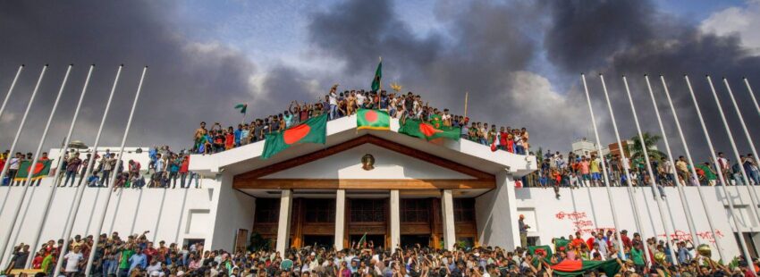 Este lunes, 5 de agosto, ha sido muy intenso en Bangladesh después de que la primera ministra Sheikh Hasina abandonara el país junto a su hermana a bordo de un helicóptero militar tras varios días de protestas. Era la señal de que ha caído ha caído el gobierno y el país comienza una nueva etapa en principio interina. El jefe de Estado Mayor del Ejército, el general Waker-Uz-Zaman, fue el encargado de anunciar esta renuncia y de que “estamos entrando en un periodo de transición política” a través de un gobierno interino que no dejará impune los asesinatos –se estima que más de 300 en el mes de julio, fundamentalmente de universitarios– producidos durante las protestas.