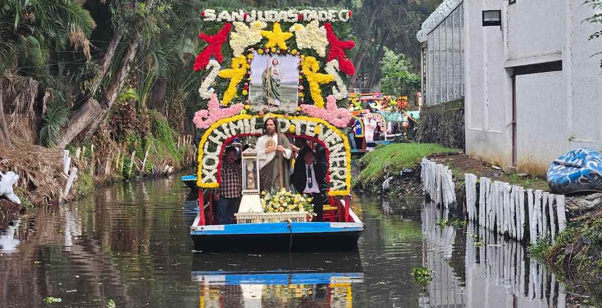 Las trajineras de Xochimilco suelen llevar al frente el nombre de personas escritos con flores, por lo que el pueblo elaboró una portada especial para el traslado de la reliquia, con la leyenda: ‘San Judas Tadeo, Xochimilco te venera’.