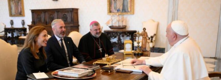 Tras recibir a Saiz Meneses, llegó el turno de recibir al arzobispo de Zaragoza, Carlos Escribano, junto al presidente del Gobierno de Aragón, Jorge Azcón, y la alcaldesa de Zaragoza, Natalia Chueca. Según informó el gobierno autonómico “el presidente Azcón invita al Santo Padre a visitar Aragón y Zaragoza en el 40 aniversario del viaje de Juan Pablo II”. Además, “durante la recepción, han abordado asuntos como el reconocimiento del Papa Luna o conflictos pendientes respecto a los bienes de la Iglesia en Aragón”. “El Santo Padre es cercano, agradable y cariñoso. La reunión que hemos mantenido ha sido especial desde el punto de vista personal, pero característica de lo que hoy es el Papa, que quiere acercarse al mundo a través de la cercanía y el amor de la Iglesia católica”, señaló Azcón ante los medios de comunicación.