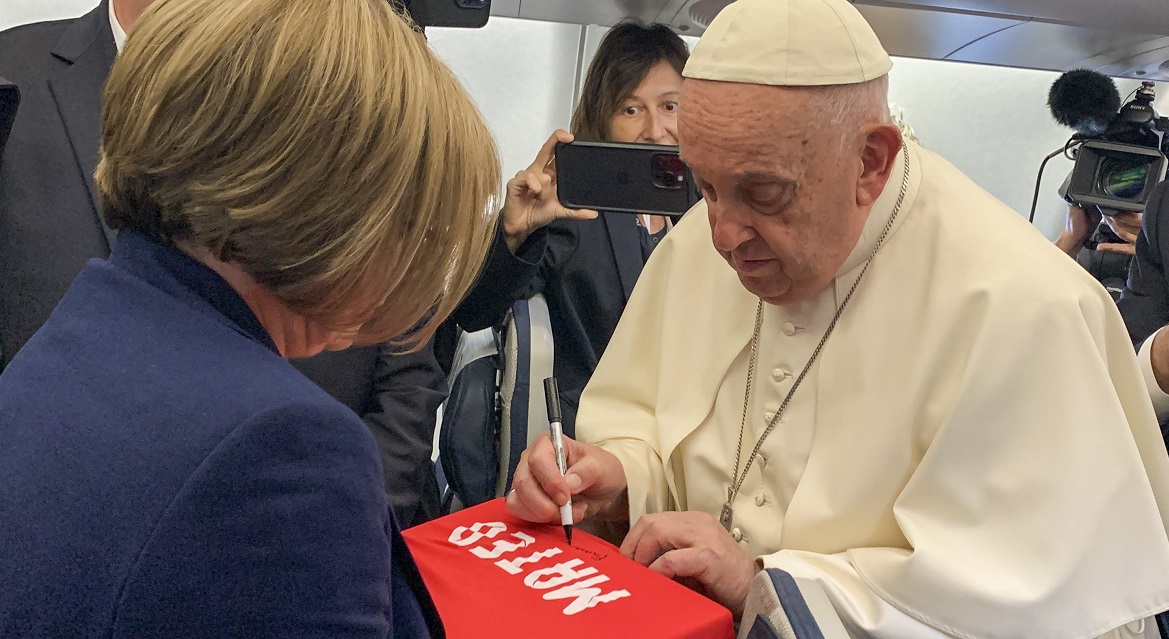 Tanto la firma de la camiseta como la entrega de la linterna tuvieron lugar en el habitual saludo de Francisco a los ochenta periodistas que le acompañan en esta peregrinación apostólica que le llevará por Indonesia, Papúa Nueva Guinea, Timor Oriental y Singapur. “Os agradezco el venir a este viaje. Os agradezco la compañía en este viaje tan largo, que creo que es el más largo que he hecho”, comentó el pontífice a los comunicadores.