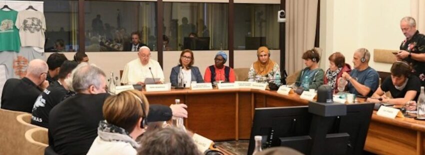 Durante su exposición, el Papa estuvo acompañado de referentes de movimientos sociales de la Argentina, entre ellos Juan Grabois y el titular de la Unión de Trabajadores de la Economía Popular (UTEP), Alejandro “Peluca” Gramajo. También intervienen en la cumbre el prefecto del Dicasterio para el Servicio del Desarrollo Humano Integral, Cardenal Michael Czerny, el Cardenal Peter Turkson y dirigentes del núcleo fundador del vínculo entre los movimientos populares y la Iglesia como Xaro Castelló (España) y Joao Pedro Stedile (Brasil).