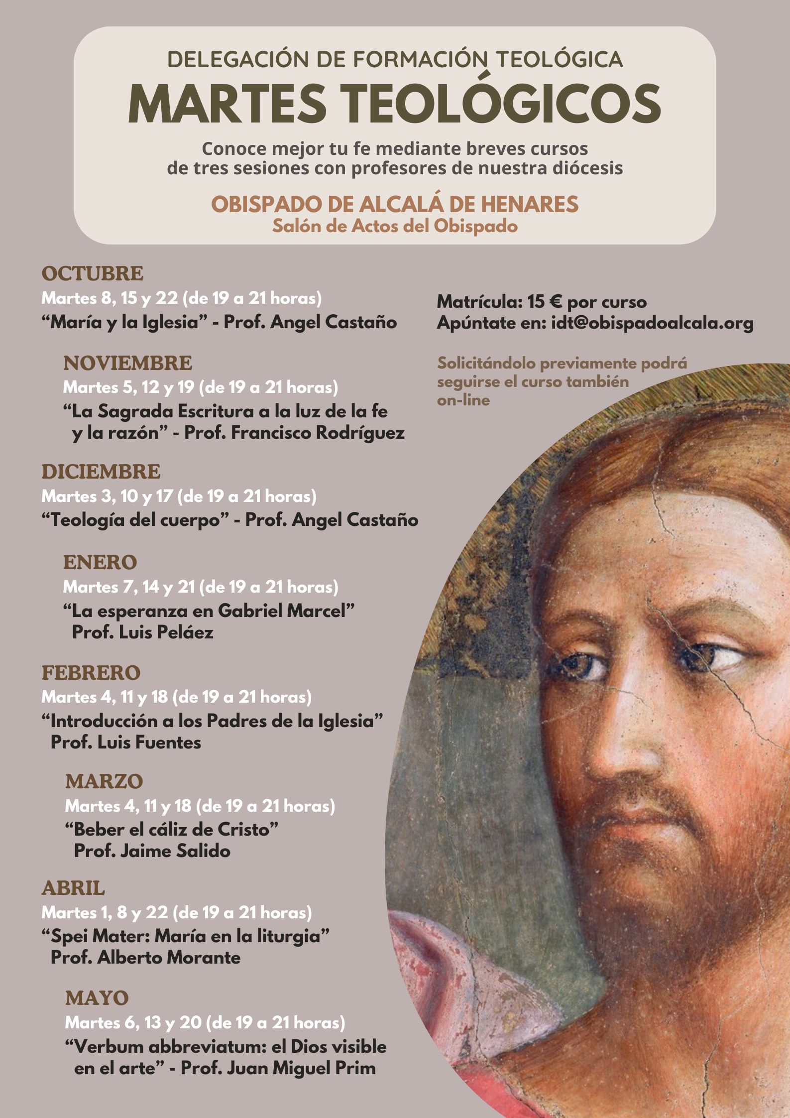 La delegación de formación teológica de la diócesis de Alcalá de Henares estrena este curso 24/25 una nueva oferta de formación a partir del mes de octubre de 2024. Se trata de los “Martes teológicos”, un ciclo de breves cursos de contenido teológico, de carácter presencial, que tendrán lugar tres martes consecutivos cada mes en el salón de actos del palacio arzobispal de Alcalá de Henares, en horario de 19 a 21 horas. También será posible seguir los curso en modalidad online, solicitándolo en el momento de realizar la inscripción.