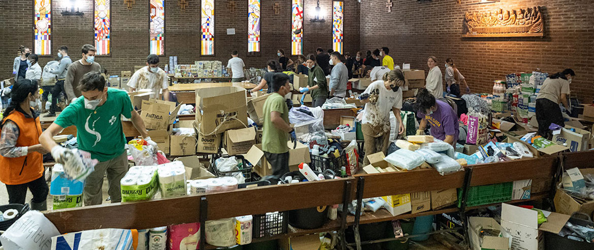 Desde el segundo día, “coordinados con el ayuntamiento, en las parroquias nos encargamos de distribuir comida, agua y otros bienes de primera necesidad que van llegando de donaciones de toda España”. Y eso, claro, mientras continúan las labores de limpieza: “En El Pilar, los locales parroquiales se quedaron anegados y no hay forma de sacar todo el barro. De hecho, en el sótano, el agua sigue llegando por debajo de la rodilla. Y eso que, además del centenar diario de voluntarios organizados, que vienen incluso de la Universidad Católica de Valencia, ya cualquier vecino que pase por la calle y nos ve tan apurados, se ofrece a echar una mano”.