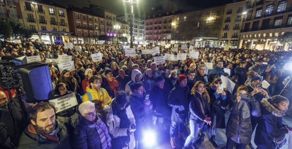 El tejido social y empresarial burgalés se concentró ayer en la Plaza Mayor del municipio ante la decisión del Consistorio de retirarles las subvenciones por la imposición del Grupo Municipal de Vox al Grupo Municipal del Partido Popular, en el Gobierno. La periodista Rosalía Santaolalla leyó a los asistentes a la manifestación el manifiesto ‘Por un Burgos solidario, incluyente y diverso‘, respaldado por 4.500 firmas. En él, se instó al Ejecutivo municipal a dar marcha atrás en su decisión y mantener el convenio con las tres organizaciones. Durante el acto, pudieron verse carteles que rezaban lemas como ‘Migrar no es delito’, ‘Este es nuestro efecto llamada’ y ‘La diversidad suma’.