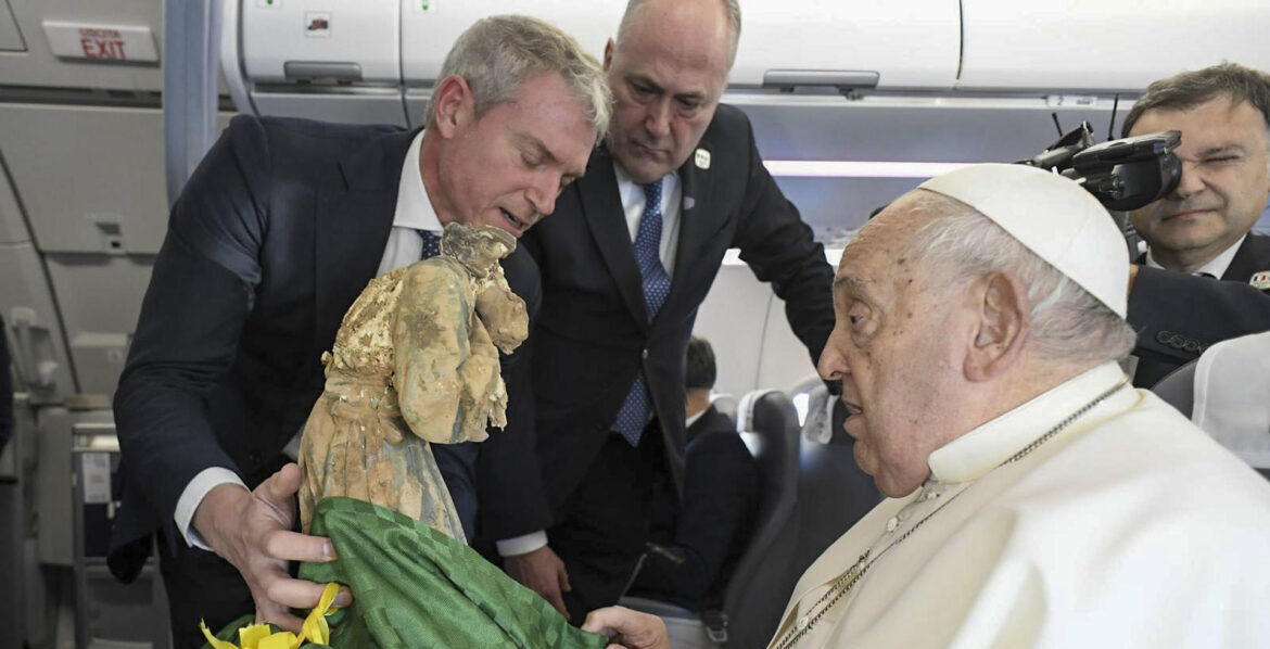 Tras el habitual saludo a los periodistas, el equipo que acompaña al Santo Padre le hizo llegar este regalo. Corbí le explica al obispo de Roma en su escrito que esta talla también refleja el sentir “de los sacerdotes que hemos llorado y estado embarrados, limpiando, animando y enterrando a seres queridos“.