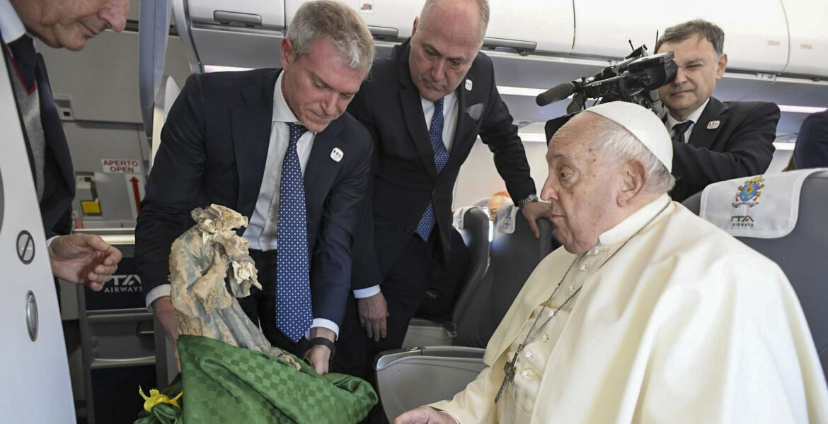 A bordo del avión papal, 15/12/2024.- El papa Francisco recibió este domingo en el avión en el que viajaba a Córcega la escultura de un ángel de la parroquia de Pincaya que acabó destrozado por la dana que afectó a Valencia a finales de noviembre, "en memoria de todas las personas que fallecieron y de las tantas familias que lo han perdido todo". EFE/Vatican Media -SOLO USO EDITORIAL/SOLO DISPONIBLE PARA ILUSTRAR LA NOTICIA QUE ACOMPAÑA (CRÉDITO OBLIGATORIO)-