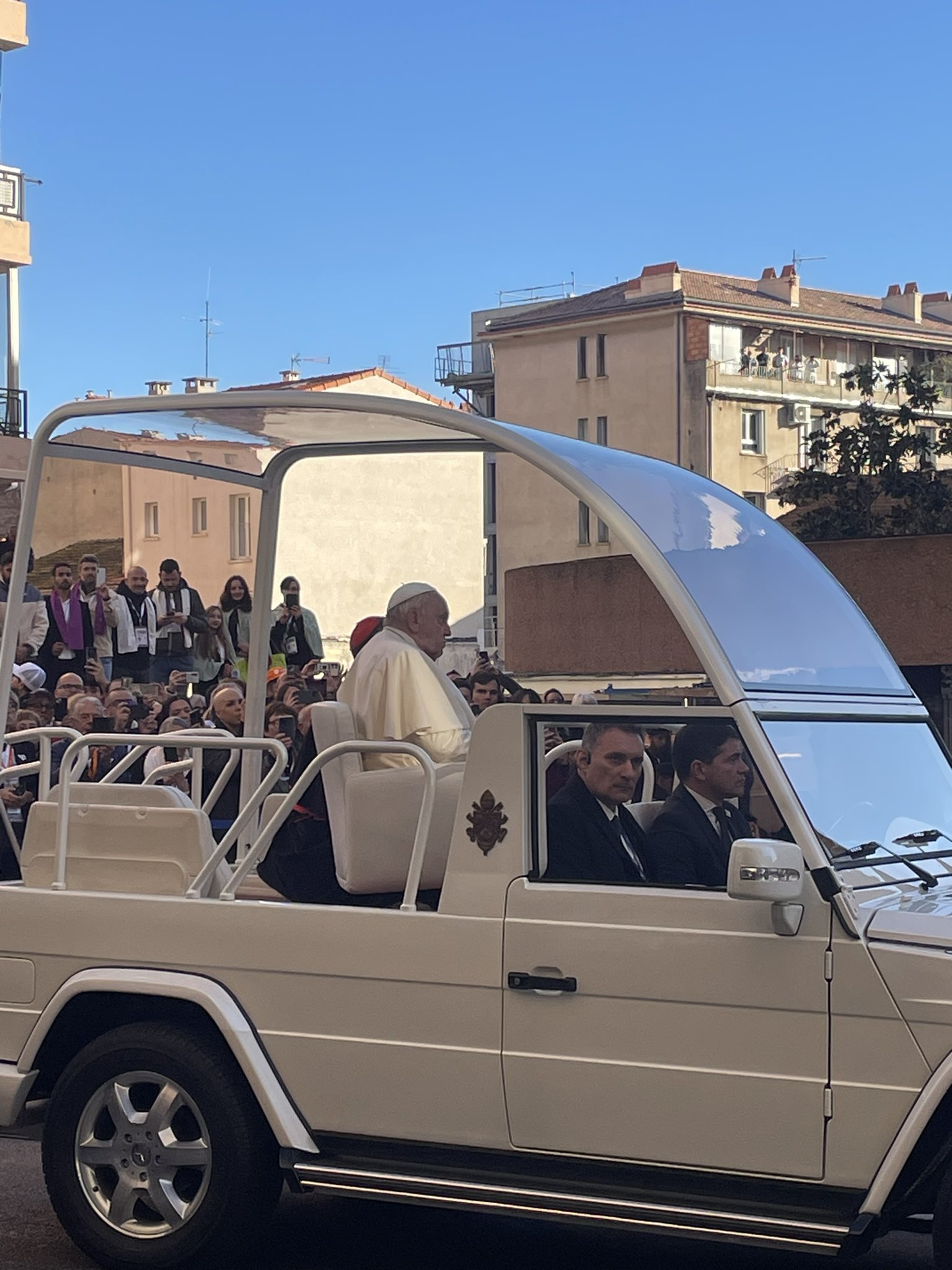 En el aeropuerto de Ajaccio que lleva el nombre del Emperador corso Napoleón Bonaparte, el Pontífice y su sequito han sido recibidos por el ministro del Interior de la República Francesa Bruno Retailleau , a quien corresponde ocuparse de los asuntos religiosos, por el obispo el cardenal Francisco Javier Bustillo (nacido en Pamplona) y otras personalidades. Honores militares e interpretación de los himnos concluidos la comitiva papal se puso en camino hacia el Palacio de Congresos donde Bergoglio clausura el Congreso sobre la Religiosidad Popular en el Mediterráneo.