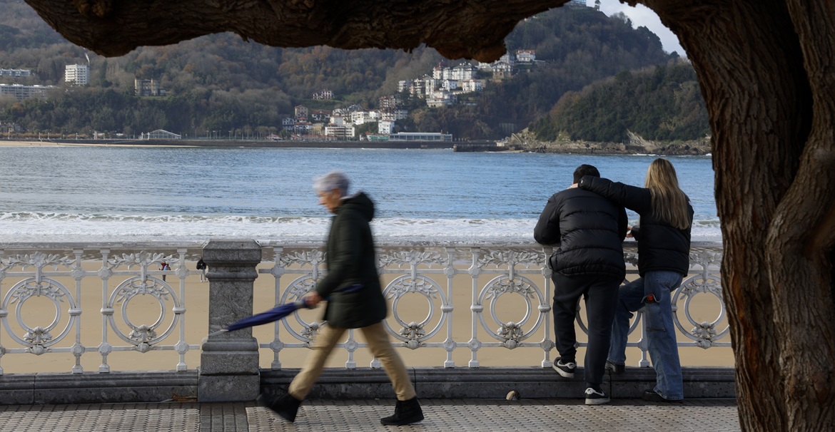 SAN SEBASTIÁN, 20/12/2024.- Una pareja observa este viernes la playa de la Concha de San Sebastián. Los cielos del País Vasco se presentan nubosos, caerán lluvias débiles, sobre todo en el norte, la cota de nieve subirá hasta los 1.400 metros, las temperaturas máximas descenderán moderada a notablemente y el viento soplará moderado del norte-noreste. EFE/Juan Herrero