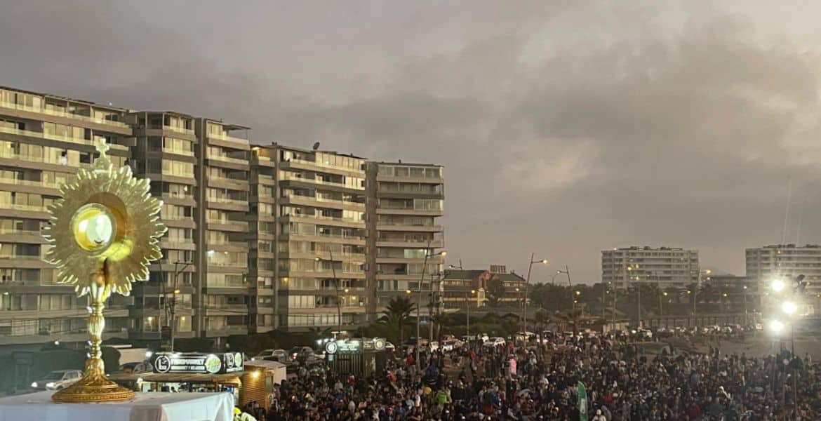 La tarde anterior, en la playa del Faro, con el océano Pacífico como marco y un impresionante atardecer se realizó la vigilia de oración inspirada en el lema Tú Palabra es lámpara para mis pasos. Comenzó con una adoración eucarística que incluyó una procesión con el Santísimo Sacramento.