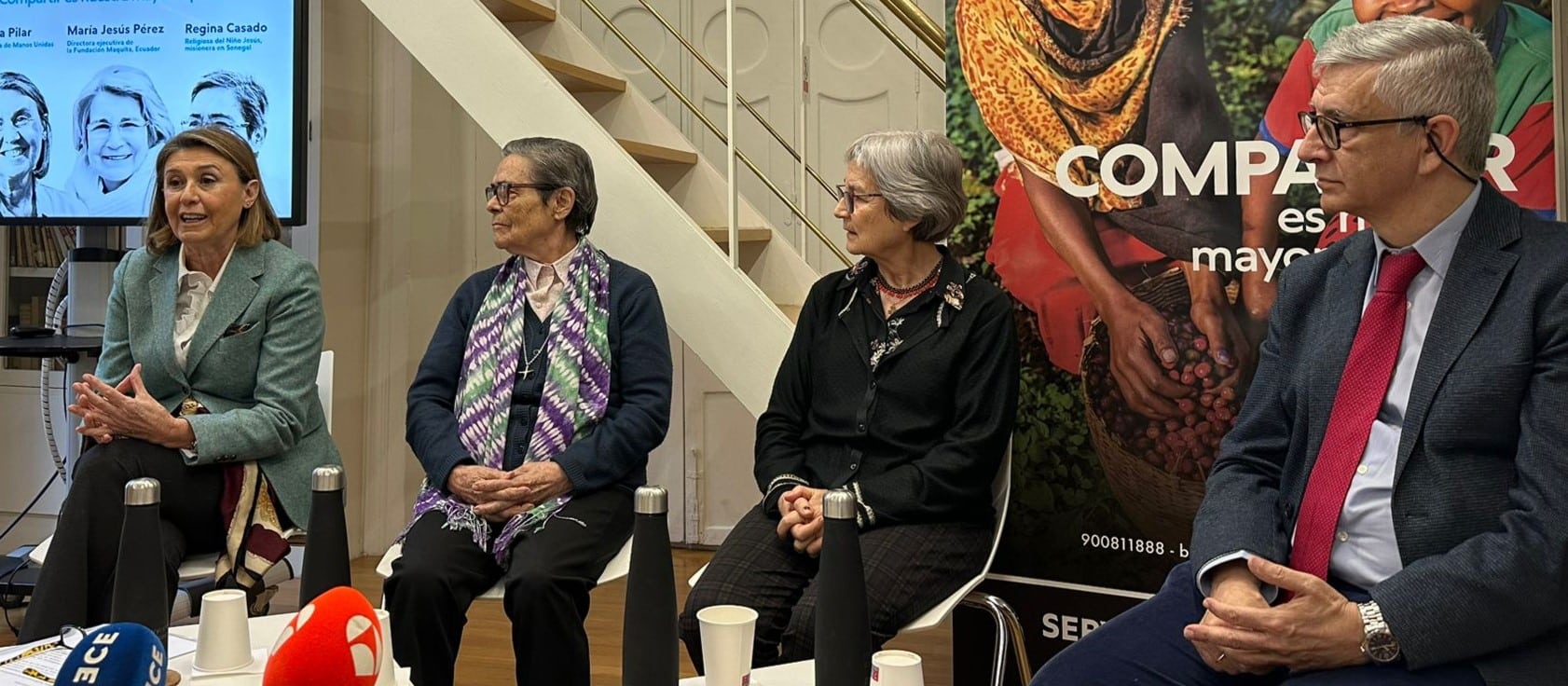 En la mañana de este jueves 6 de febrero, Manos Unidas ha presentado en la Fundación Ortega-Marañón, en Madrid, su campaña ‘Compartir es nuestra mayor riqueza’. Y lo ha hecho con un coloquio en el que han intervenido Cecilia Pilar, presidenta de la entidad eclesial, el economista José María Larrú y las misioneras María Jesús Pérez y Regina Casado.