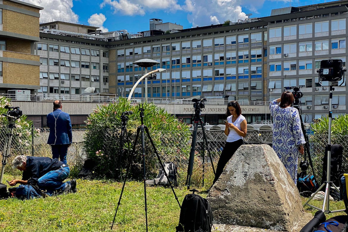 Rome (Italy), 08/06/2023.- Journalists gather near the Agostino Gemelli University Hospital where Pope Francis underwent his surgery, in Rome, Italy, 08 June 2023. Pope Francis underwent an operation for an abdominal hernia on 07 June at the Gemelli hospital in Rome, where he is expected to stay for 'several days', the Vatican said. (Papa, Italia, Roma) EFE/EPA/GIUSEPPE LAMI