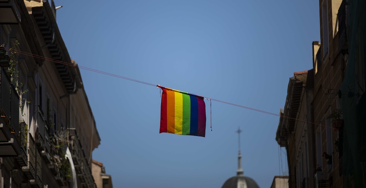 Bandera lgtbi en una calle de Madrid con una iglesia al fondo