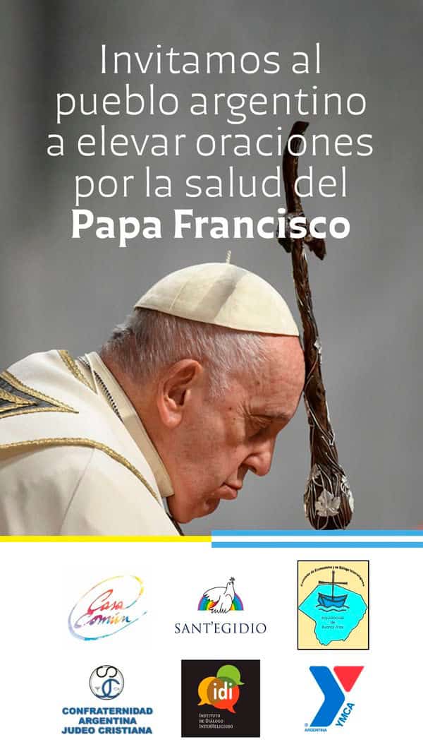 La Comisión de Ecumenismo y Diálogo Religioso de la arquidiócesis de Buenos Aires, la Comunidad Sant’ Egidio, el Movimiento de los Focolares, la Confraternidad Argentina Judeo Cristiana, la Asociación Cristiana de Jóvenes Argentina (YMCA), la asociación Casa Común y el Instituto de Diálogo Interreligioso (IDI), invitan a todo el pueblo argentino a unirse en oración por la salud del papa Francisco y su recuperación.