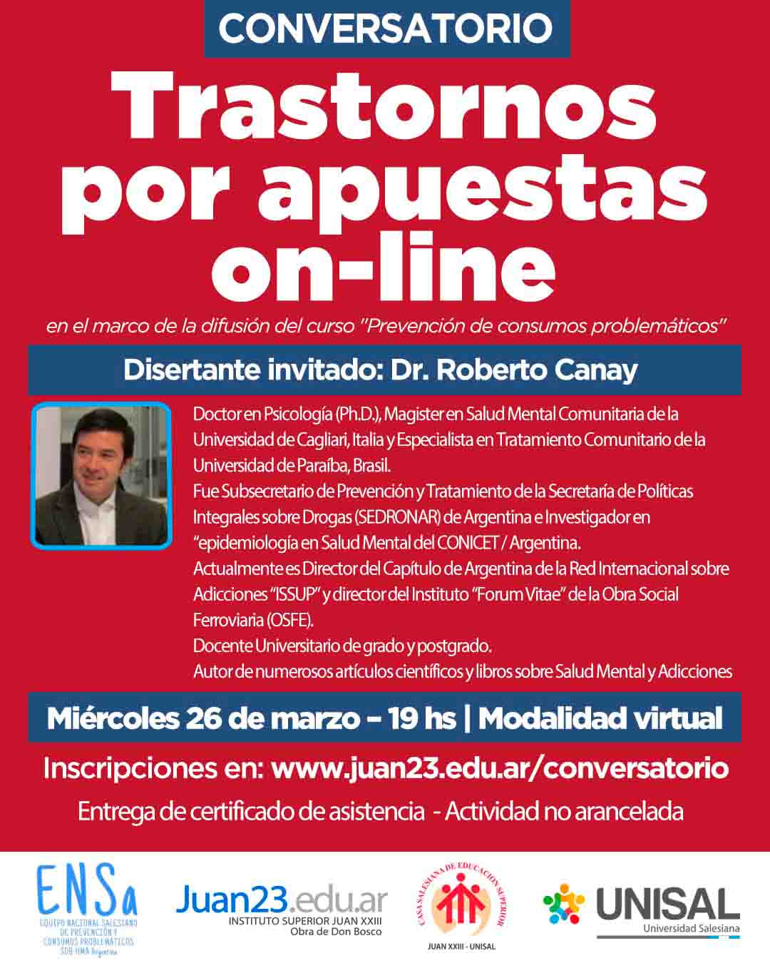 El doctor en Psicología, Roberto Canay, animará esta instancia. Es un profesional que obtuvo la maestría en Salud Mental y Comunidad de la Universidad de Cagliari (Italia), y es especialista en Tratamiento Comunitario de la Universidad de Paraiba (Brasil). En Argentina, fue subsecretario de Prevención y Tratamiento de la Secretaría de Políticas Integrales sobre Drogas de Argentina (Sedronar) e investigador en epidemiología en salud mental del Consejo Nacional de Investigaciones Científicas y Técnicas (Conicet).