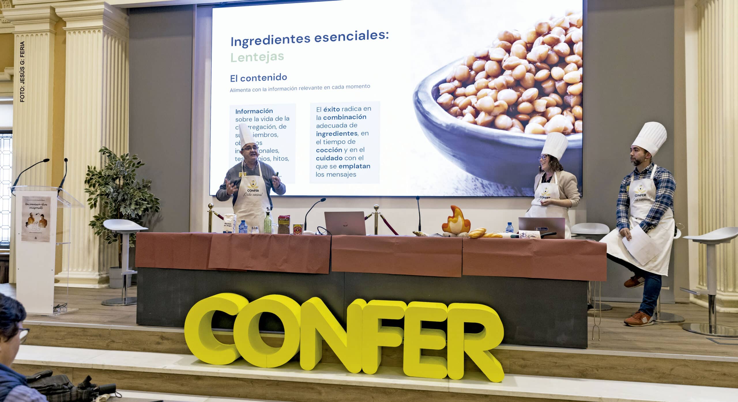 Al grito de “¡Oído cocina!”, con delantal y toque como uniforme, Cordero tomó la palabra junto a Javier Valiente (Salesianos) y Víctor Recuerda (Maristas) para presentar ‘a fuego lento’ lo que podría denominarse como ‘la receta de la comunicación interna’. O lo que es lo mismo, las claves para establecer una hoja de ruta a través de un plan de comunicación. Junto a ellos, también preparó este particular taller práctico Amalia Casado (Regnum Christi), ausente en el congreso por estar aplicando a pie de obra estas premisas en su familia carismática.