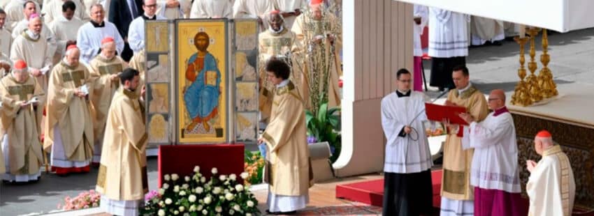 La celebración de la misa ha comenzado con un rito particular de la misa papal: el ‘Resurrexit’. Durante el canto, al comienzo de la celebración, los diáconos abrían las portezuelas de un icono bizantino de la Resurrección –el llamado icono ‘Acheropita’, es decir, no pintado por mano humana, que se encuentra en la basílica de San Juan de Letrán–. Este símbolo, de claro sabor oriental, recuerda a Pedro como primer testigo de la Resurrección y por eso se repite ante el Papa, sucesor del príncipe de los apóstoles. También se ha proclamado el evangelio en latín y en griego. Y es que en esta ocasión la liturgia papal remarca la coincidencia de fecha con la primera luna nueva de primavera para celebrar el día de la Pascua con el canto, tras el evangelio del “Stichi” y “Stichirá”, unas alabanzas de la liturgia bizantina de Pascua.