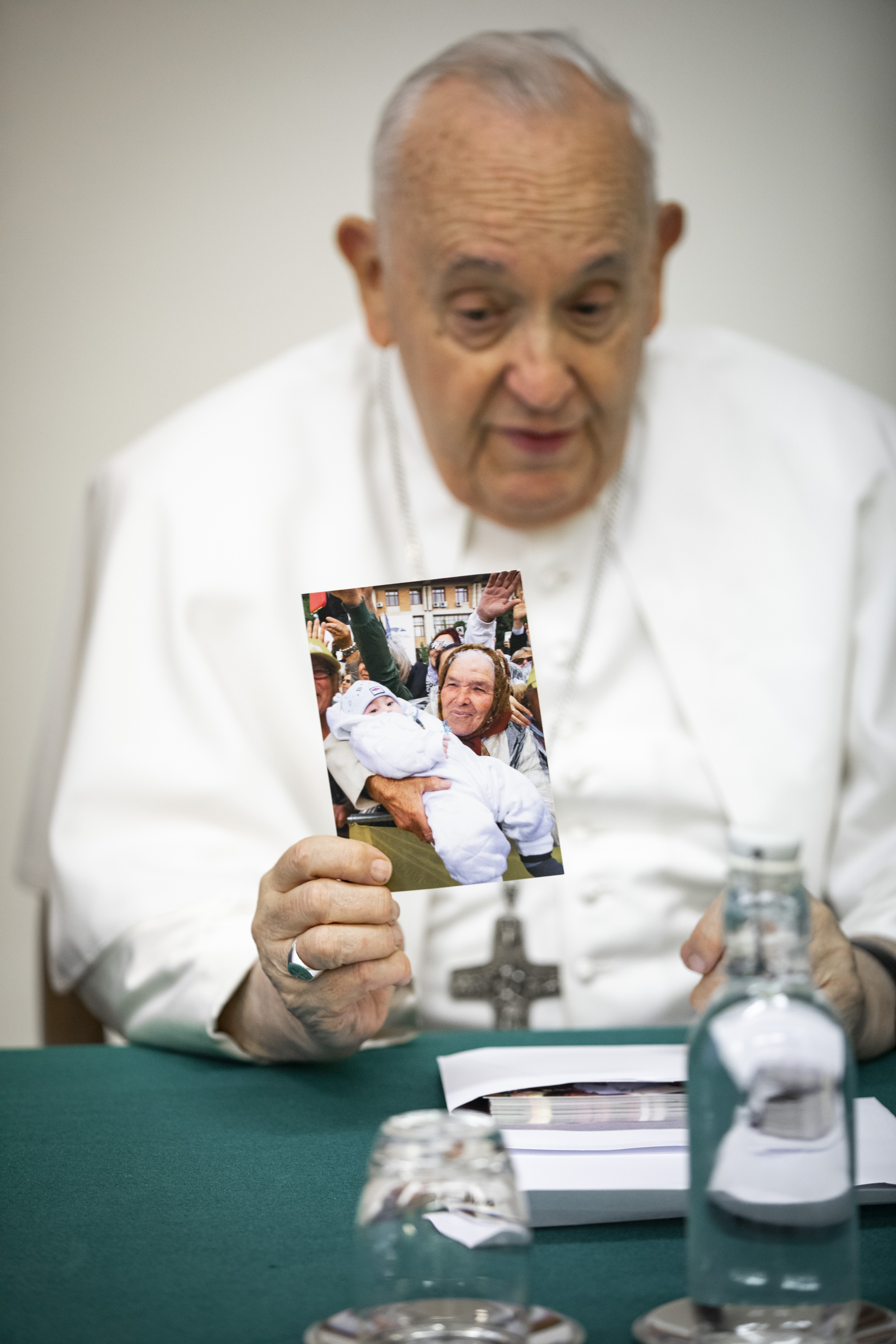Francisco explica a Vida Nueva cómo le marcó ese instante: “Vino la viejita con su nieto en brazos, de cuatro o cinco meses, quizá menos; me mira y me lo muestra. Y eso me tocó, porque son dos generaciones… Los viejos con los jóvenes, la mujer que ve su futuro. Y me quedé tan emocionado que siguió caminando el auto y pensé: ‘¡Qué lástima que no le hice venir a la vieja para subirla arriba!’. Durante el discurso, cité a la vieja. Cuando llegué, le dije al fotógrafo: ‘¡Qué lástima!’. Y me dice: ‘Me di cuenta y saqué una foto’. Y añadí esto al discurso, sobre el encuentro de viejos y jóvenes, un tema muy recurrente. ¿Qué sucedió? Que esto recorrió el mundo. En Rumanía no digo que cada familia la tiene, pero casi. La estampita corrió por todos los lados en rumano. Y a los rumanos no se les ocurrió otra cosa que traer a la anciana a una audiencia, hace un par de meses, feliz. Esta vez, sin el niño”.
