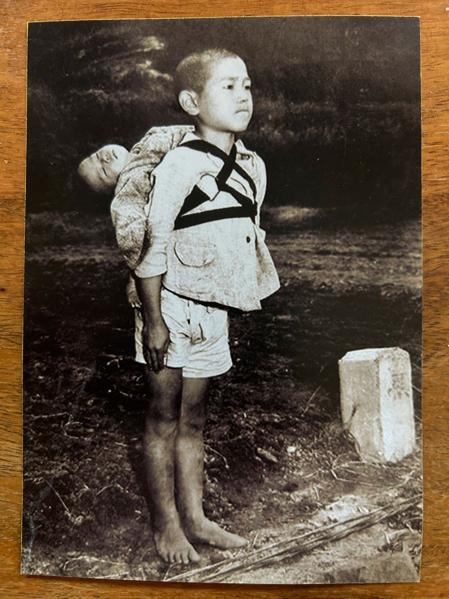 A Bergoglio le cautiva una imagen del fotógrafo norteamericano Joseph Roger O’Donnell. Tenía 23 años, era marine del Ejército y estaba en Nagaski, la ciudad japonesa sobre la que cayó la bomba atómica el 9 de agosto de 1945. La estampita explica que muestra a “un niño que espera su turno en el crematorio para su hermano muerto en su espalda. La tristeza del niño solo se expresa en sus labios mordidos y rezumados de sangre”. “Vino a verme el hijo de este fotógrafo en mi viaje a Japón (la viuda no pudo venir) y le saludé. Es ‘el fruto de la guerra’”, añade el Papa.