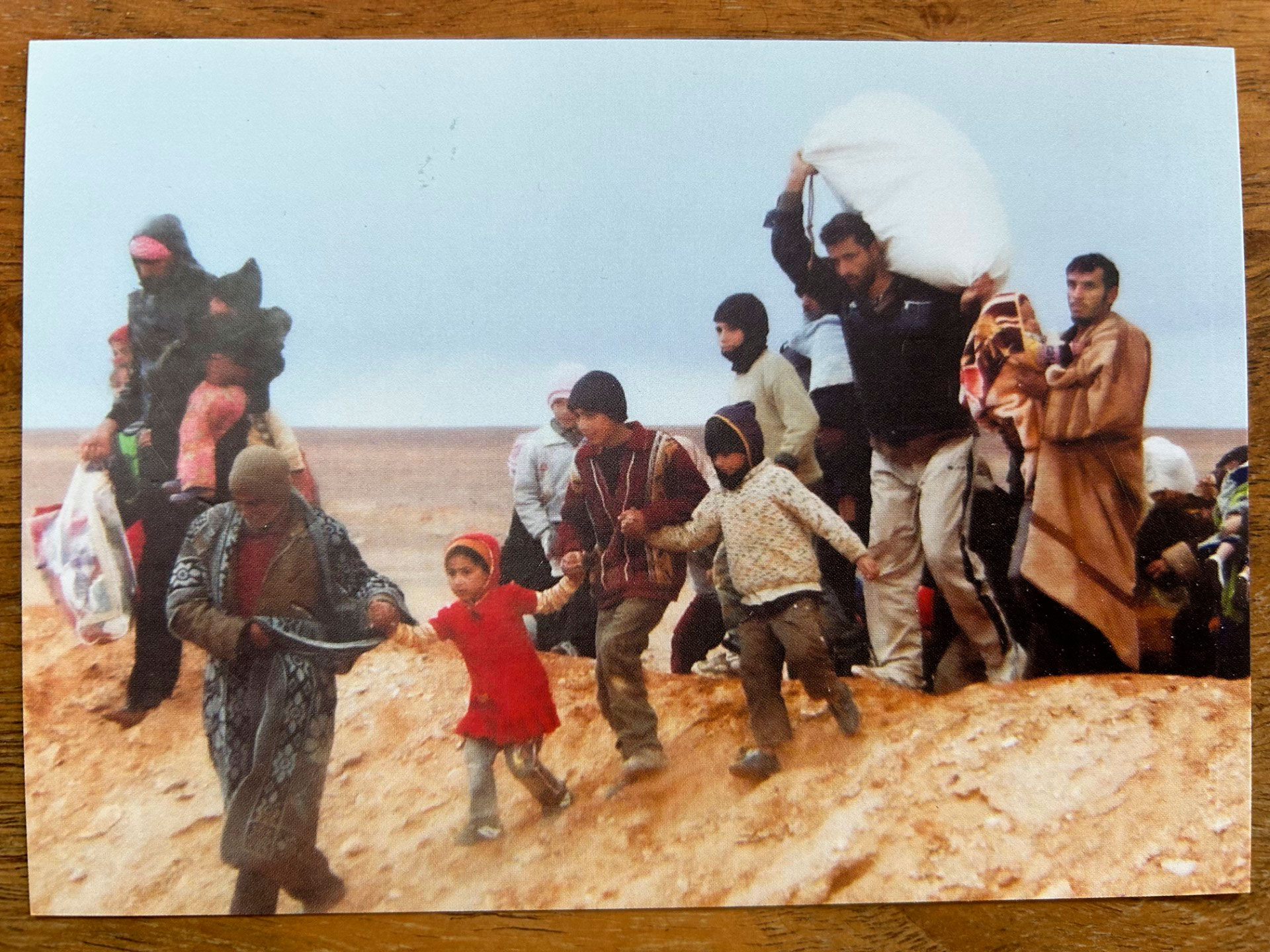 Este exilio entronca directamente con otra de las estampas, en la que se ve a varias familias cargando por el desierto todos los enseres que han podido rescatar del hogar abandonado. Ancianos guiando a niños de la mano, hombres cargando grandes bolsas en las que toda su vida está dentro, mujeres con la cabeza gacha… Con gesto adusto, conmovido, Francisco mira la foto y dice: “Esta de los migrantes habla por sí sola”.