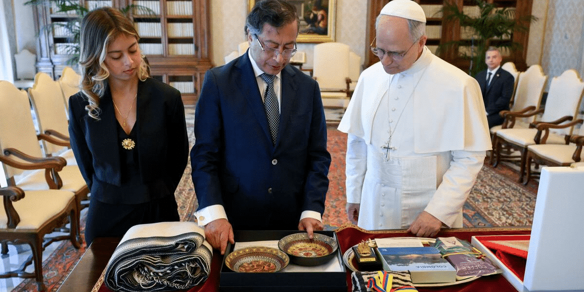 En esta audiencia no faltaron los regalos. Petro le dio a León XIV una réplica de la Balsa Muisca, una mochila arhuaca tejida por mujeres indígenas de la Sierra Nevada de Santa Marta, una hamaca artesanal de Morroa (Sucre) y un café colombiano.