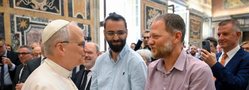 De hecho, entre las 250 personas que se encontraban en la Sala Clementina, en primera fila estaban el israelí Maoz Inon, cuyos padres fueron asesinados por Hamás, y el palestino Aziz Sarah, cuyo hermano fue asesinado por el ejército israelí. El papa Prevost subrayó que “ahora son amigos y colaboradores”. “Ese gesto permanece como testimonio y signo de esperanza”, enfatizó justo después.