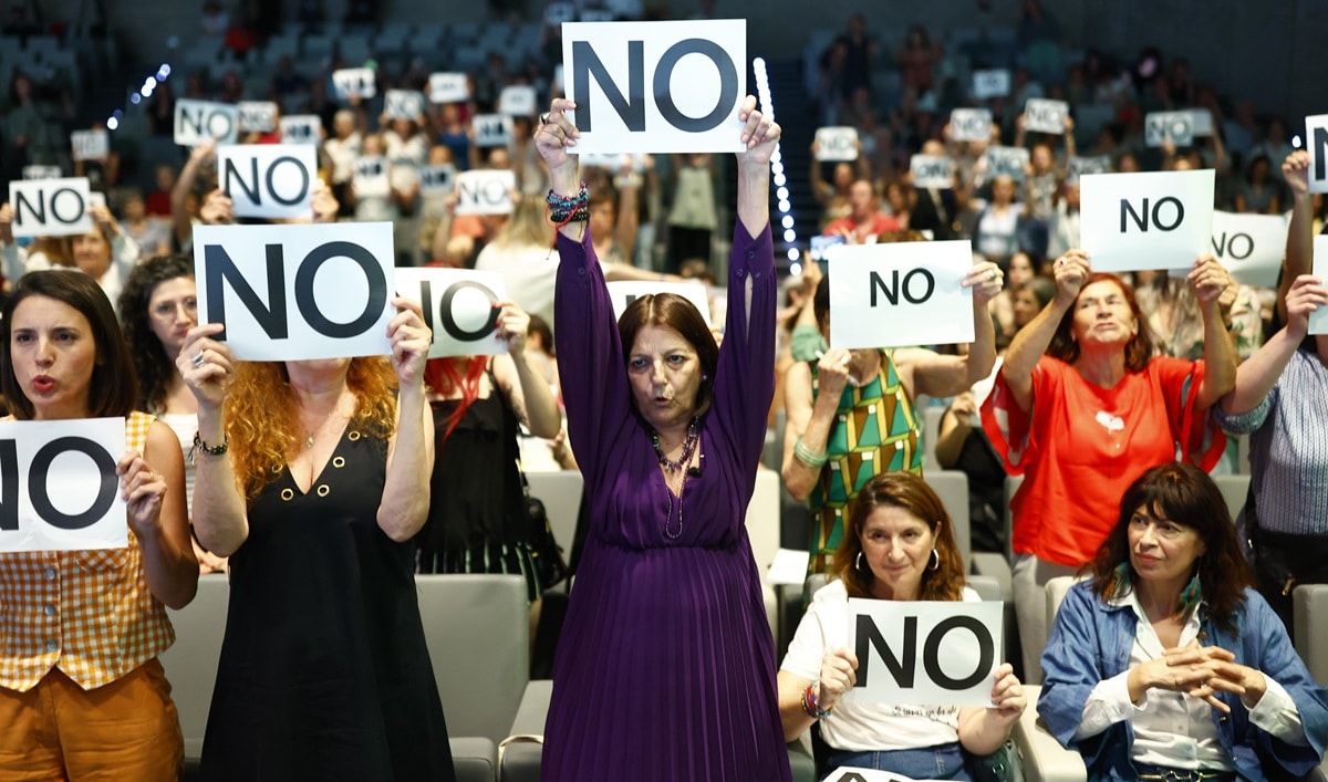 La ex ministra de Igualdad, Irene Montero, se sumaba a los gritos junto a la periodista Cristina Fallarás, mientras que la actual ministra del ramo, la socialista Ana Redondo, con rostro de sorpresa, permaneció sentada y se negó a secundar la protesta y no cogió papel alguno.