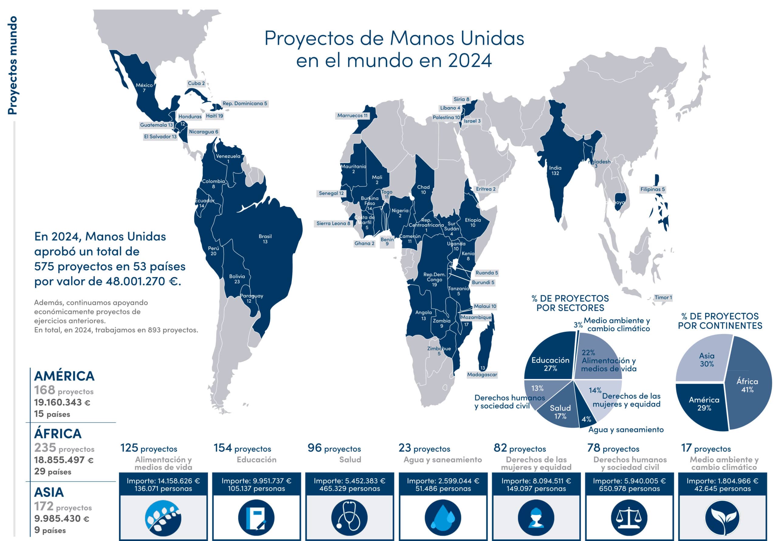 Manos Unidas destinó el pasado año una inversión récord de 48 millones de euros a la financiación de 575 nuevos proyectos de desarrollo en 53 países de África, Asia y América, según recoge su Memoria de Actividades 2024 presentada hoy en Madrid.