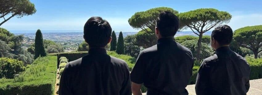 Tres jóvenes seminaristas mexicanos realizan actividades diversas, entre estas labores de jardinería en Castel Gandolfo, en la residencia donde pasa el verano el papa León XIV.