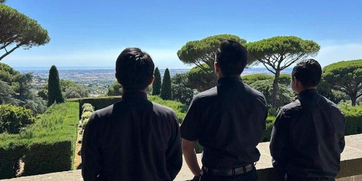 Tres jóvenes seminaristas mexicanos realizan actividades diversas, entre estas labores de jardinería en Castel Gandolfo, en la residencia donde pasa el verano el papa León XIV.