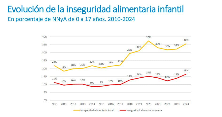 La mitad experimenta situaciones graves de privación: una proporción de los NNyA viven en hogares donde se experimenta situaciones de hambre por no tener que comer. Entre 2010 y 2017, esta prevalencia se ubicaba en torno a un 9%; en 2020 llegó al 15%; y a un 16,5% en 2024: un tercio de la infancia se encontraba en situación de vulnerabilidad por esta situación.